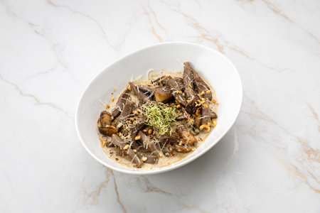 Gourmet beef tongue with creamy sauce, mushrooms and sprouts on marble background