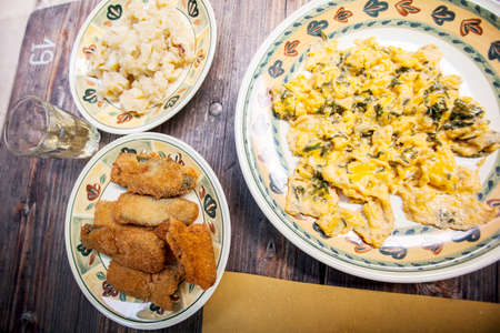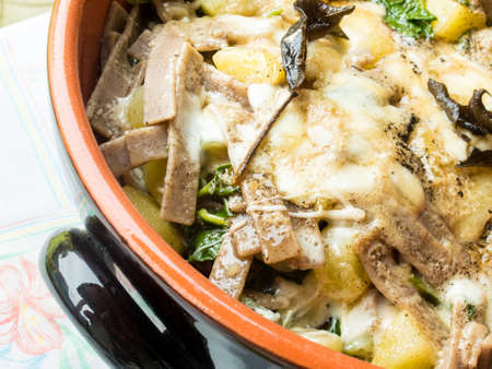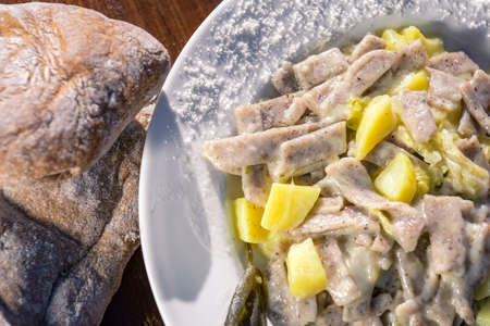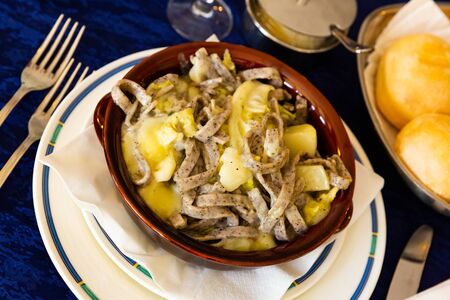 Close-up view of traditional Catalan cuisine dish in cafe restaurant bar - potatoes and chicken meat with pepper vegetables
