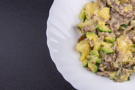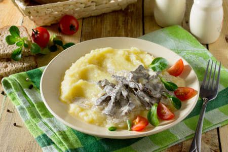 Hot stew meat heart with sour cream and mashed potato side dish. Concept of healthy food.