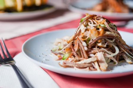 Close up of rice noodles with pork in a white plate on the table