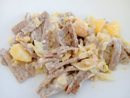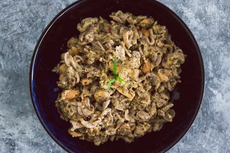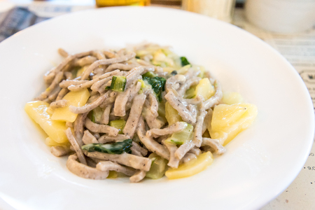 Traditional pasta with poultry and vegetables in a white sauce. Top view. Selective focus.