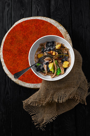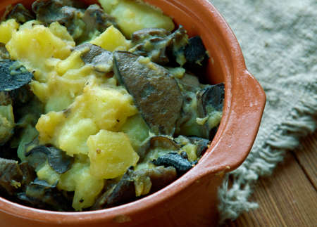 Mushroom Tushanka- Belarusian potato stew on a wooden background