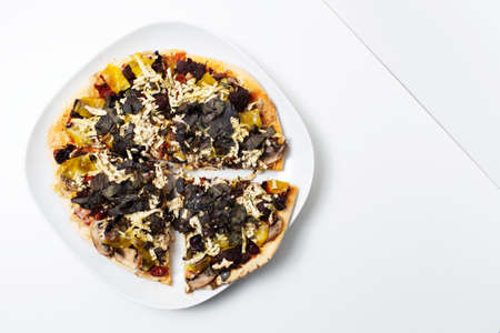 Homemade vegan pizza on white plate against white background. Top view.