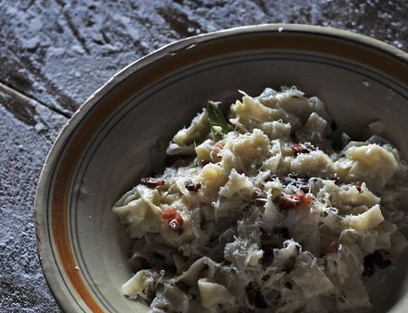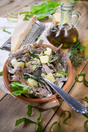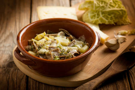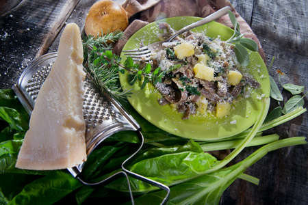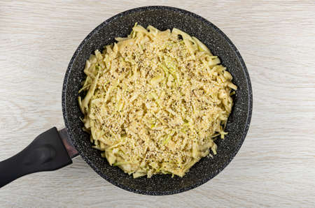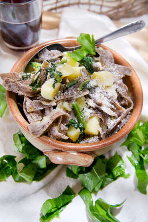 buckwheat tagliatelle with potato, cabbage and parmesan for italian meal
