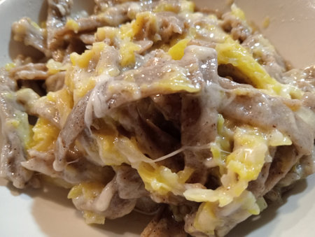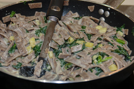 Close-up of cooked pizzoccheri, italian traditional dish
