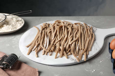 Uncooked homemade soba (buckwheat noodles) and ingredients on gray table