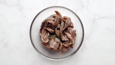 Canned anchovy fillets in glass bowl on white marble table, top view