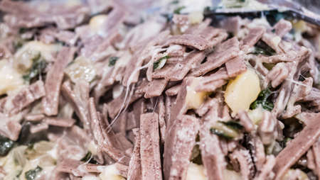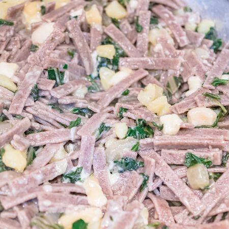 Close up of the succulent and typical Italian dish Pizzoccheri. Typical dish from Valtellina, Lombardy, Italy. Horizontal view.