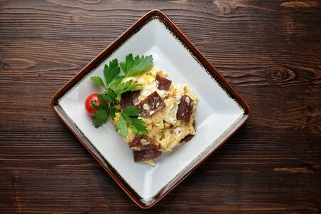 Omelet with meat on a white plate on a dark wooden background.