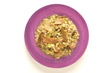 Plate of thick lentil soup with vegetables, raisins, and seaweed on white table
