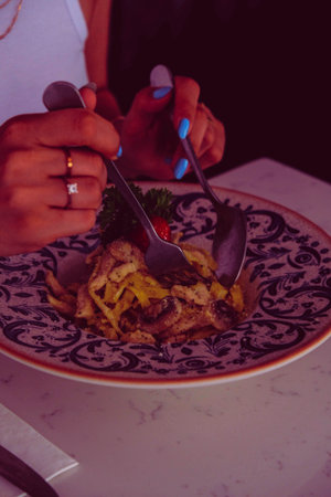 woman eating Spaghetti Carbonara with chicken and cheese