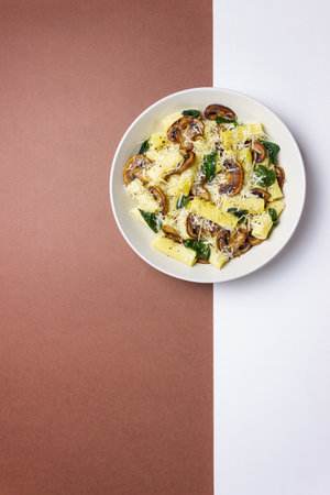 Pasta in a creamy sauce with mushrooms, spinach, and cheese. Italian cuisine. Vegetarian food