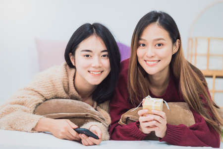 Young beautiful Asian women lesbian couple lover giving gift box in bed room at home with smiling face.Concept of LGBT sexuality with happy lifestyle together.