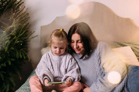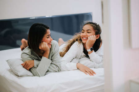 Mom and teenage daughter Happy family lying on bed her smile together at home during the holidays.