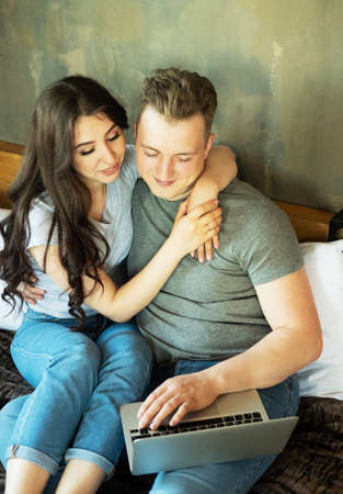 Young and attractive couple sitting on bed holding cups of coffee looking to screen of computer laptop ,Valentine's day concept.