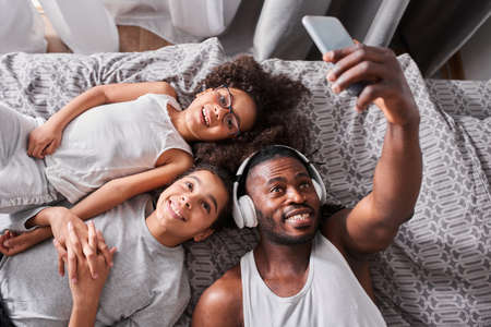 Happy excited mother and her two sons waving with hands when video calling father or taking selfie
