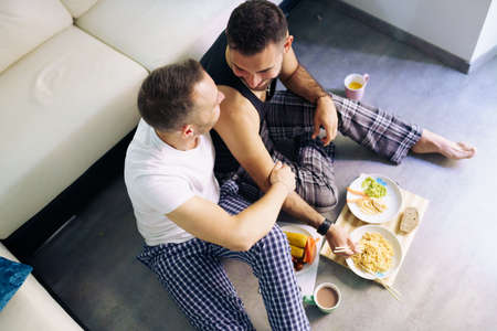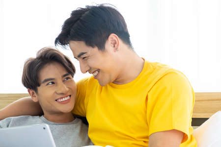 Asian gay homosexual couple hug and embracing on the bed. Gender equality and right concept, playful and romantic moment.
