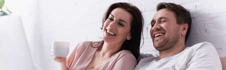 Smiling woman lying on bed near boyfriend with laptop in hotel room, banner