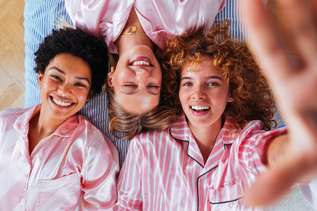 High angle view of cheerful biracial young woman taking selfie with female friends lying on bed. Technology, happy, relaxing, unaltered, friendship, togetherness, lifestyle and home concept.