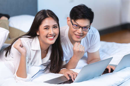 Asian business couple team working at home on the bed with laptop happy enjoy with success portrait looking camera.