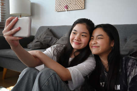 Two Asian girls taking selfie with smart smartphone while sitting together in living room.
