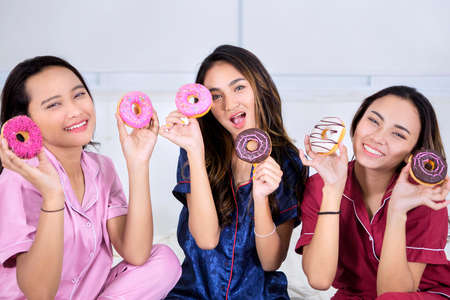 Group of happy teenage girls holding donuts while sitting together on the bed at home