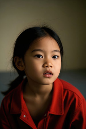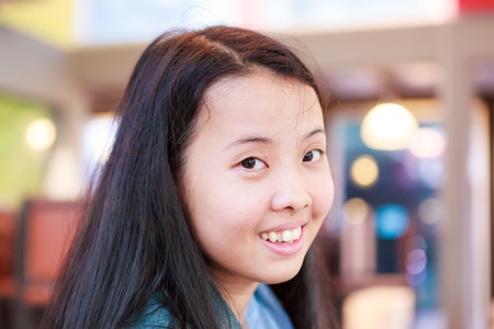 Asian eleven years old girl with long hair smile without showing teeth to the camera
