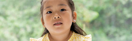 portrait of brunette and preschooler asian girl in yellow dress near window at home, banner