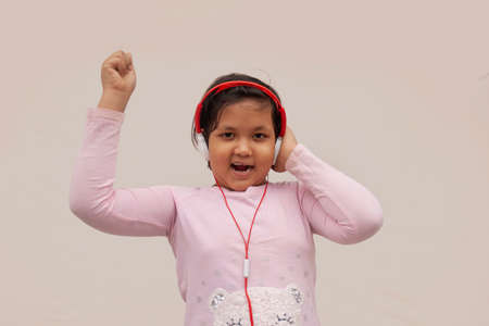 Yes I did it. Happy little girl in earphones showing winner gesture. Small child enjoying stereo sound technology. New technology. You cant really imagine music without technology. Technology concept