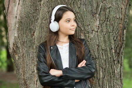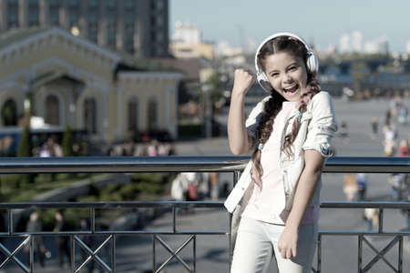 Little girl listening music enjoy favorite song excellent sound. Good vibes only. Awesome sound. Girl kid with headphones urban background. Stereo sound. Child girl autumn outfit enjoying music