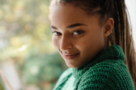 Portrait of smiling african american girl with curly hair.