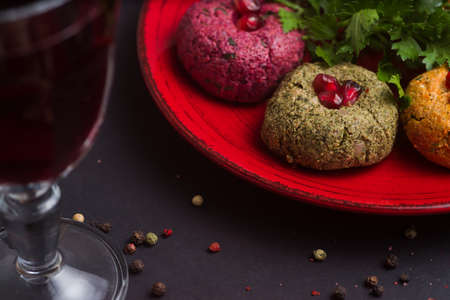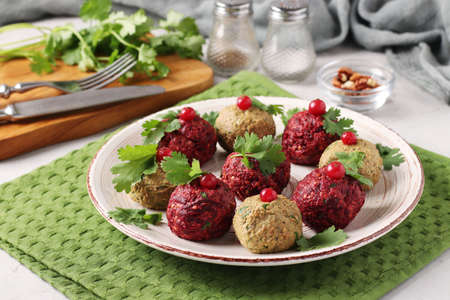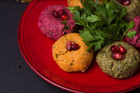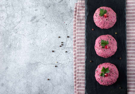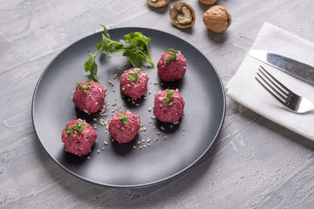 Georgian beetroot phali or pkhali with walnuts, garlic and spices on black plate