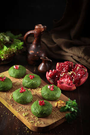 Georgian cuisine. Spinach appetizer phali with pomegranate seeds on white plate and wooden background. Top view.