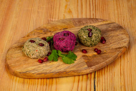 Georgian beetroot phali or pkhali with walnuts, garlic and spices on wooden background.