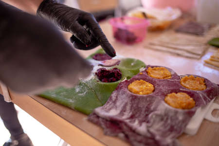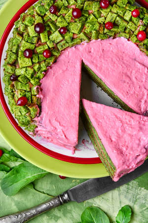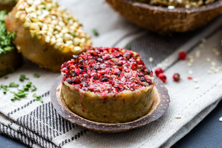 Beetroot mkhali with nut butter. Close-up, selective focus