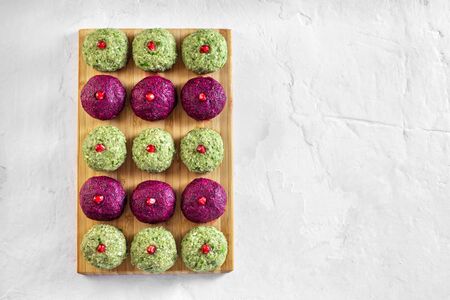 Pkhali with beets and beans on a chopping board close-up. Traditional Georgian dish of vegetables, walnuts and spices.
