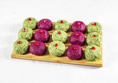 Traditional Georgian appetizer pkhali from beets and eggplants on light gray background