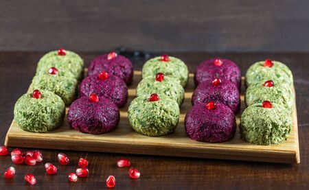 Pkhali with beets and beans on a cutting board on a dark wooden background. Traditional Georgian dish of vegetables, walnuts and spices.