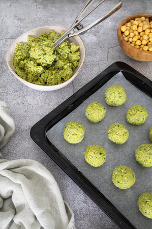 Freshly made falafel balls resting on a kitchen counter, ready to be cooked. Ingredients and spices visible in the background