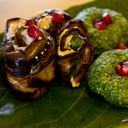 Rolls of eggplant with a filling of walnuts, Georgian snack pkhali of spinach and beet with herbs and pomegranate seeds, on sheet of chard