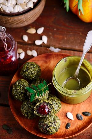 Pumpkin Seed Energy Balls..style rustic.selective focus