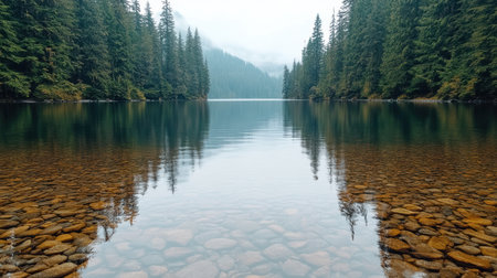 A picturesque scene of a misty lake surrounded by dense evergreen forests and majestic mountains, evoking feelings of tranquility and peace in nature