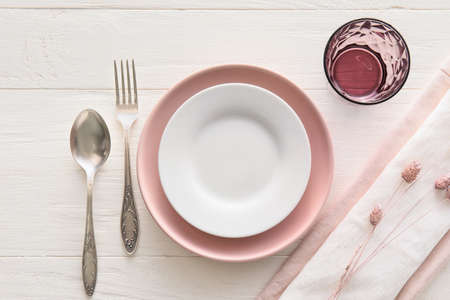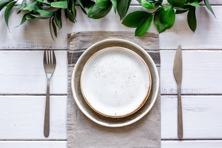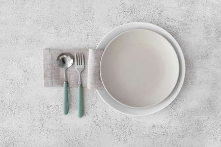 Table setting. White plate, cutlery and napkin on light gray background. Flat lay, top view.