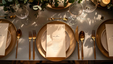 Luxury fine dining table setting for wedding menu, romantic event banner with copy space