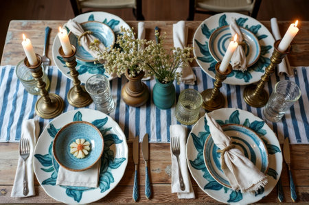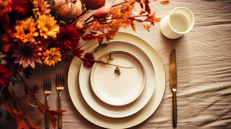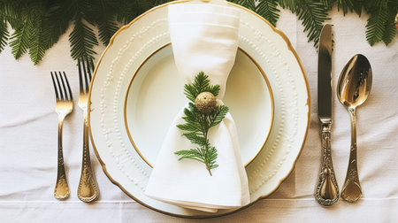 dishes and table details, such as cutlery, decorative plates and flowers, highlighting exquisiteness and attention to detail generative ai