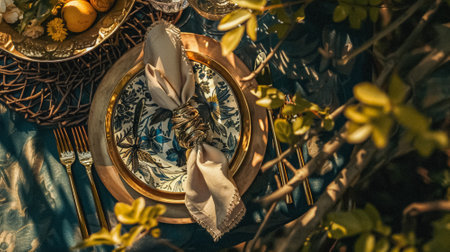 A well-lit, top-down view showcases a refined table setting with brown plates, gold forks, and decorative details, bathed in natural light, creating a sense of warmth.