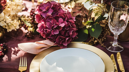 Wedding or formal dinner holiday celebration tablescape with hydrangea flowers in the English countryside garden, table setting and wine, floral table decor for family dinner party, home styling inspiration
