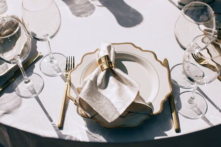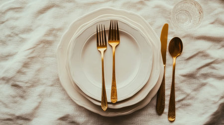 A stunning top view of an elegant table setting showcasing white plates and shiny gold cutlery on a soft linen cloth, perfect for any dining occasion.