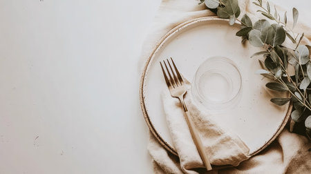 A minimalistic table setting featuring a plate, fork, and glass of water, surrounded by a soft cloth and greenery, perfect for elegant dining.