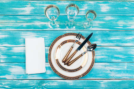 Minimalistic table setting with empty plates and polished silverware on a wooden table. Copy space above
